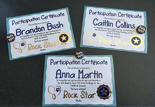 January Level 1 – Rock Star Status – Physical Participation Certificate + Token Prize/Award Winners– A laminated personalized 5×7 certificate along with a small Rock Star award pin were mailed to: