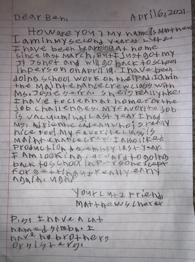 Welcome to Matthew Scherer’s Mail Room Page. Matthew is a current Lutz Student and will complete in 2027. Scroll down and click on his letters to learn more about him and to see some of the other things he’s shared with us.
